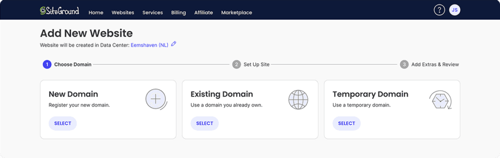 Once you log in to SiteGround, click “SET UP WEBSITE” and start with your domain: